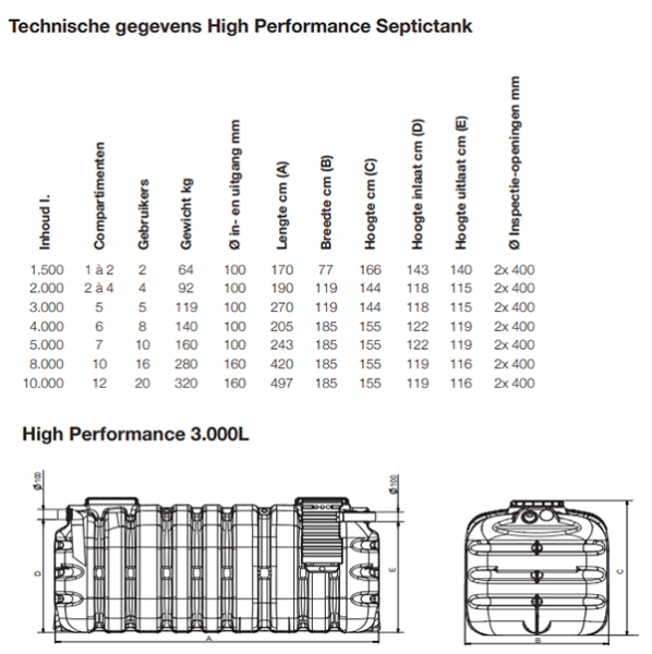 De HDPE Septic tank 2000 liter met CE Keurmerk is geschikt voor 4 personen met aan en afvoer 100mm. De uitvoering bestaat uit een tank die is gemaakt van kunststof met 2 onderhoudsschachten. Deze septic tank is geschikt om in de grond te plaatsen maar niet onder een grond die bereden of bebouwd gaat worden bijvoorbeeld een oprit. De septic tank heeft een aan- en afvoer van 100mm. De septic tank wordt gebruikt voor het opvangen van het afvalwater van uw sanitair en toilet. Het uitgefilterde residu wat achterblijft in de Septic tank dient periodiek verwijderd te worden. De septic tank is gemaakt van Hogedichtheidpolyetheen (HDPE). Hierdoor gaat de tank langer mee en is het ook nog bestand tegen corrosie. 2000 liter groot: geschikt voor 4 personen CE Keurmerk Met 2 onderhoudsschachten met kunststoffen schroefdeksel Naast levering kunnen wij ook plaatsing verzorgen. Vraag in dat geval een project offerte aan voor een prijs op maat. Bestel de Septic Tank 5000 liter direct online of neem contact op mocht u aanvullende vragen hebben. Breure is sinds 1999 de specialist in Grond- Weg en Waterbouw en Bouwmaterialen voor binnen en buiten zakelijk & particulier. Wij kopen scherp in en kunnen daarom kwaliteit voor de beste prijs leveren. Wij streven naar het werken met één leverancier, echter kan het zijn dat de artikelen afwijken van de afbeelding door de aanwezige voorraden. Mocht u in ons uitgebreide assortiment bepaalde item(s) missen, laat ons dit dan vooral weten door contact op te nemen en we voegen dit toe aan ons assortiment en/of we voegen het handmatig toe aan uw order. Heeft u een (groot) project? Vraag dan een project offerte aan voor een prijs op maat binnen 24u. Breure, altijd de beste prijs. Snel geleverd of direct af te halen in Roosendaal!